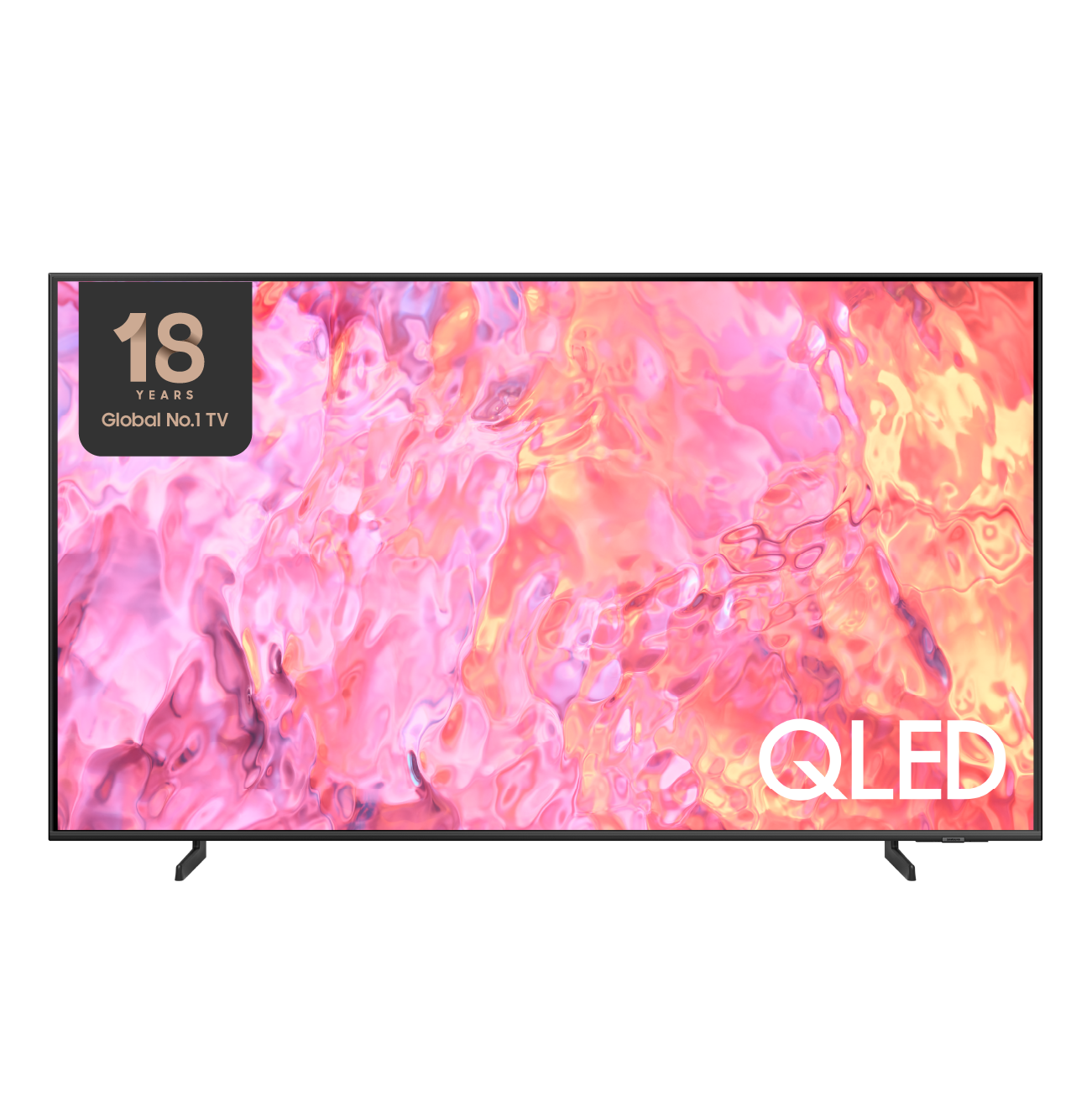 A QLED TV is placed on an Adjustable Stand.