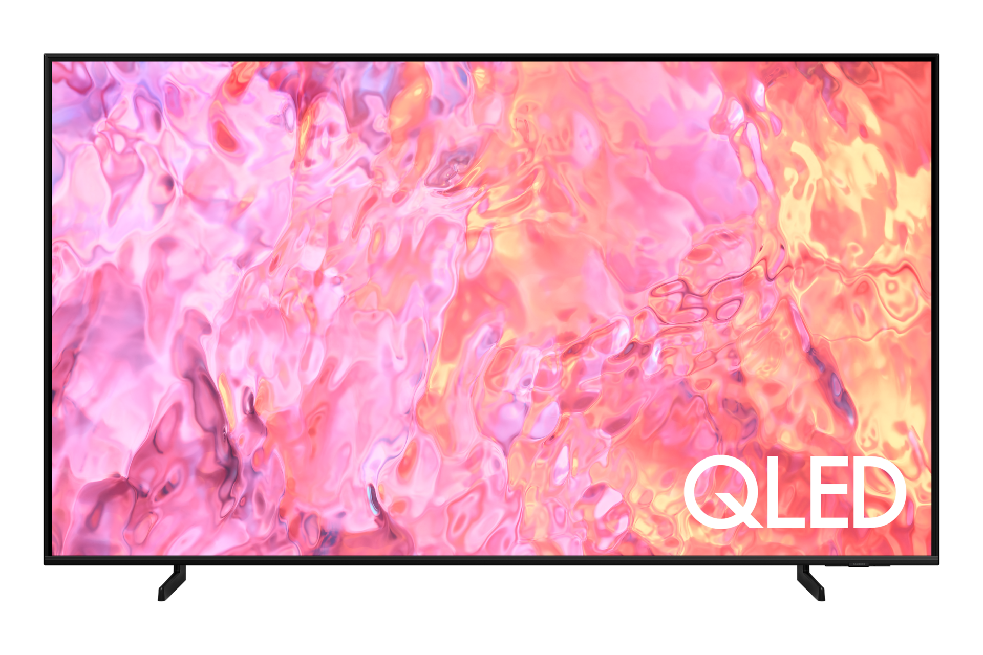 A QLED TV is placed on an Adjustable Stand.